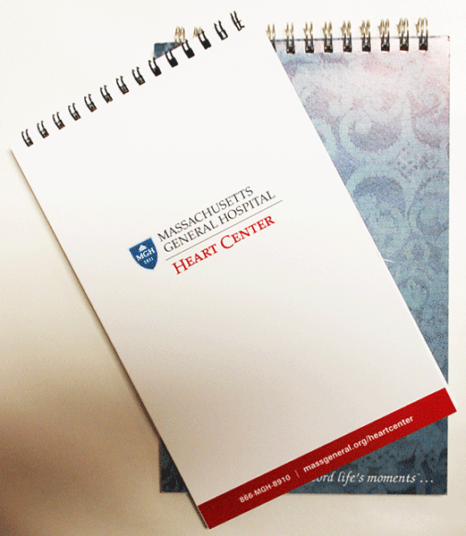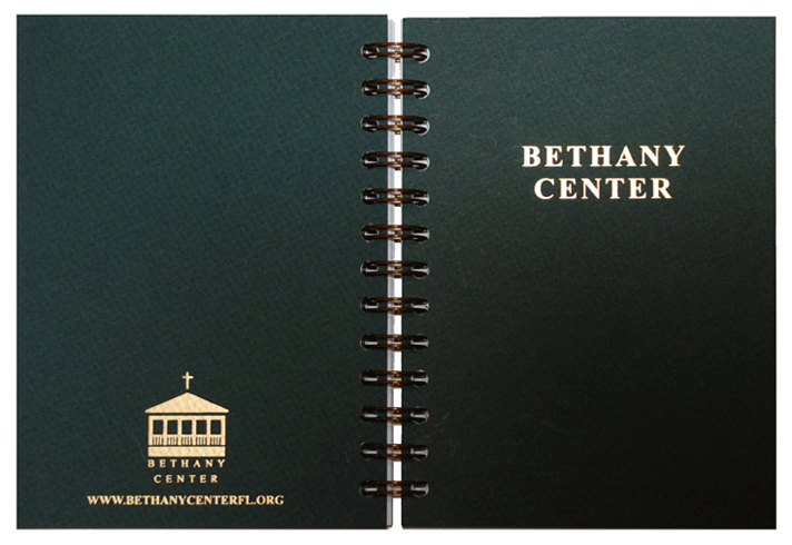 40 Ruled or Blank Sheets of Bright White #20 Bond Paper. 15 Point Semi Gloss Covers. Printed 4 Colors on Front Cover. 40 Point Chipboard Backing. Silver, White, Gold or Black Wire-O Binding. Optional 40 Point Kraft/Natural 100% Recycled Board Cover with a 1 color screen imprint. Standard Production Time - 15 Working Days or less